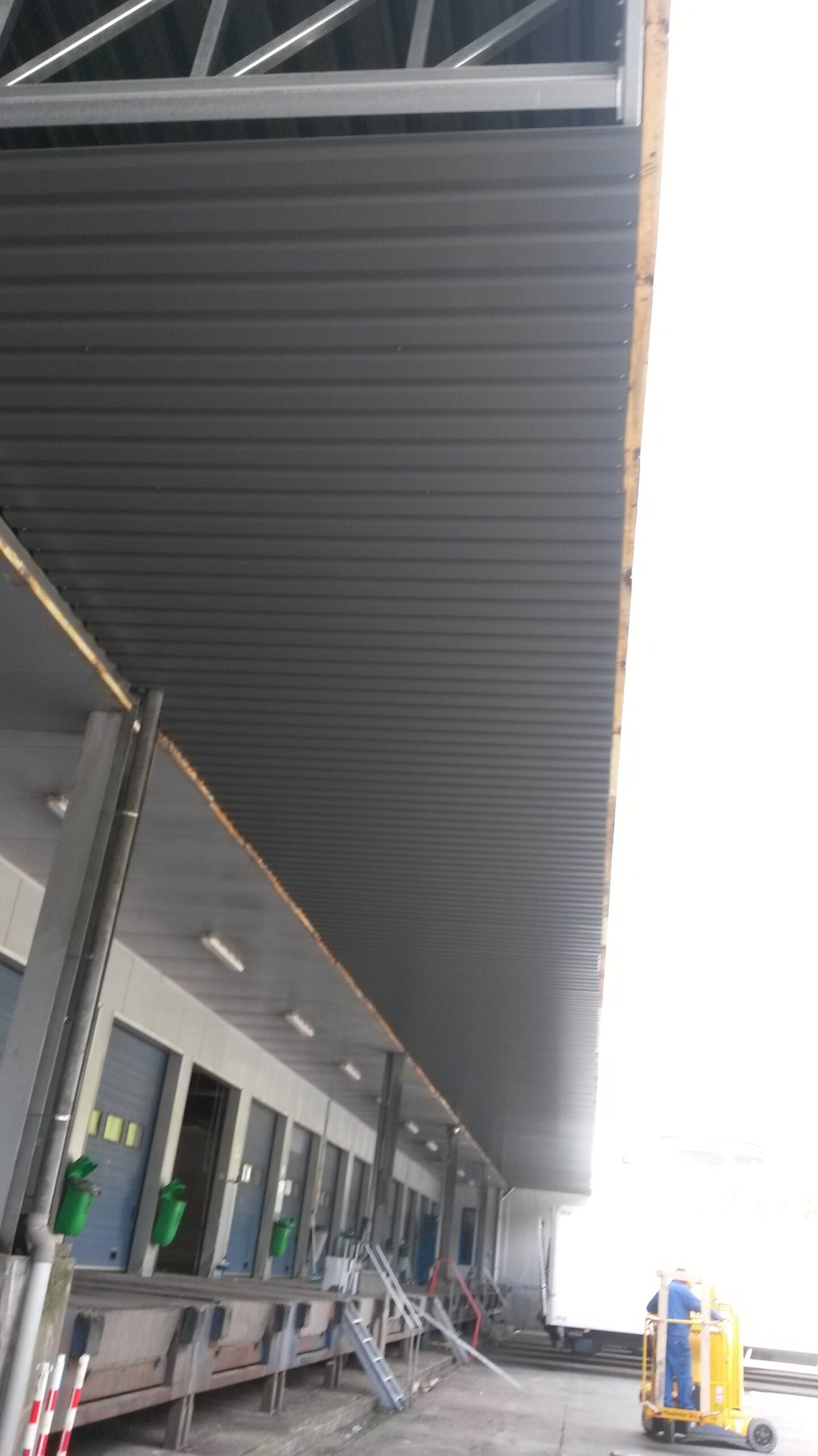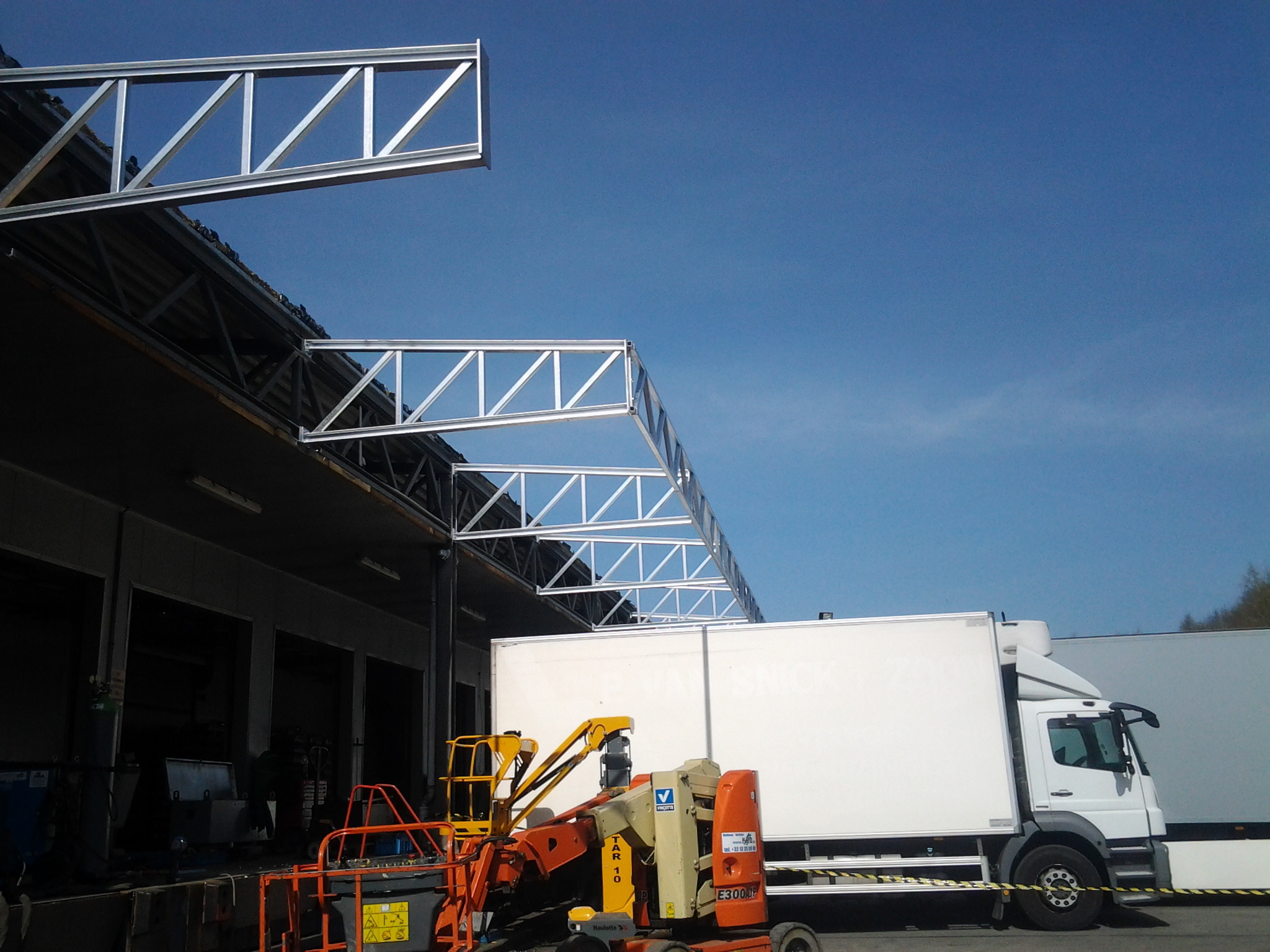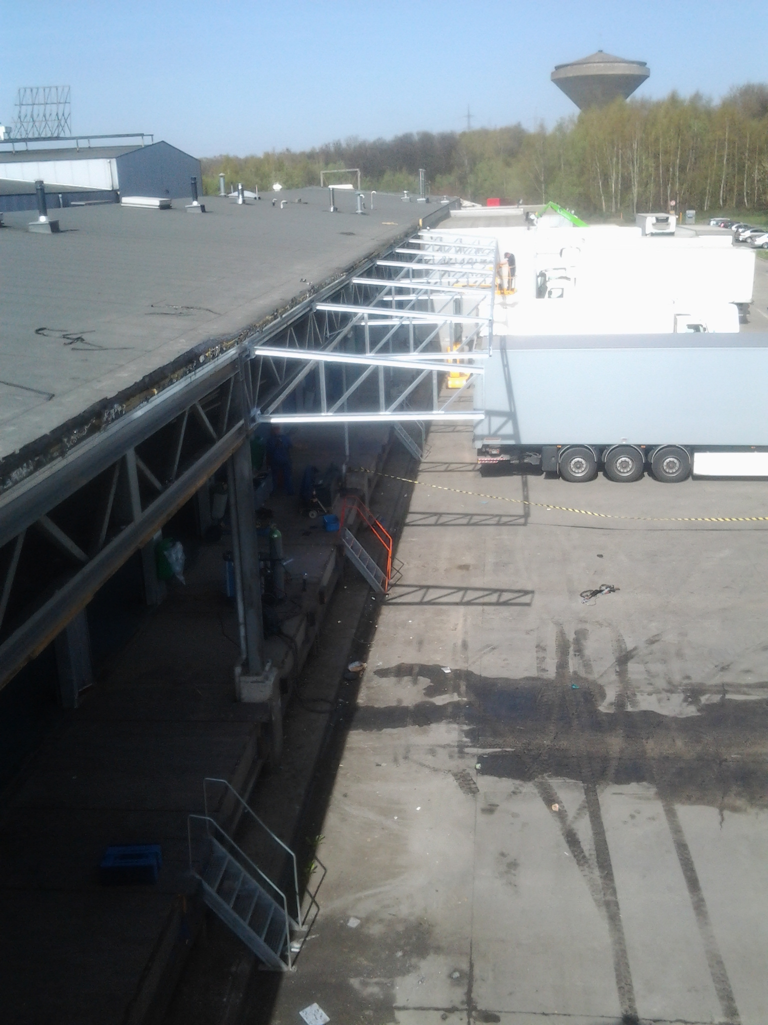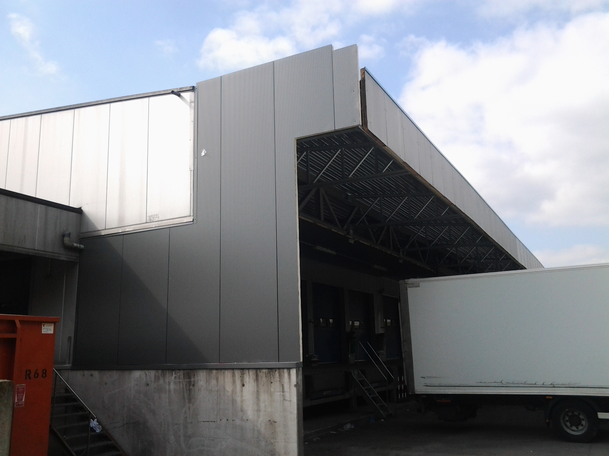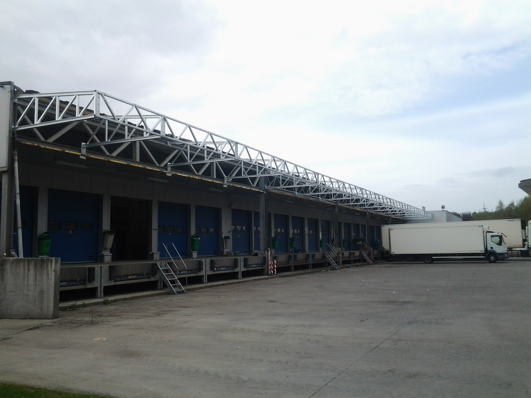 - Tegen een bestaand gebouw werd een volledige stalen luifel gebouwd om de laad- en loskades te overdekken.