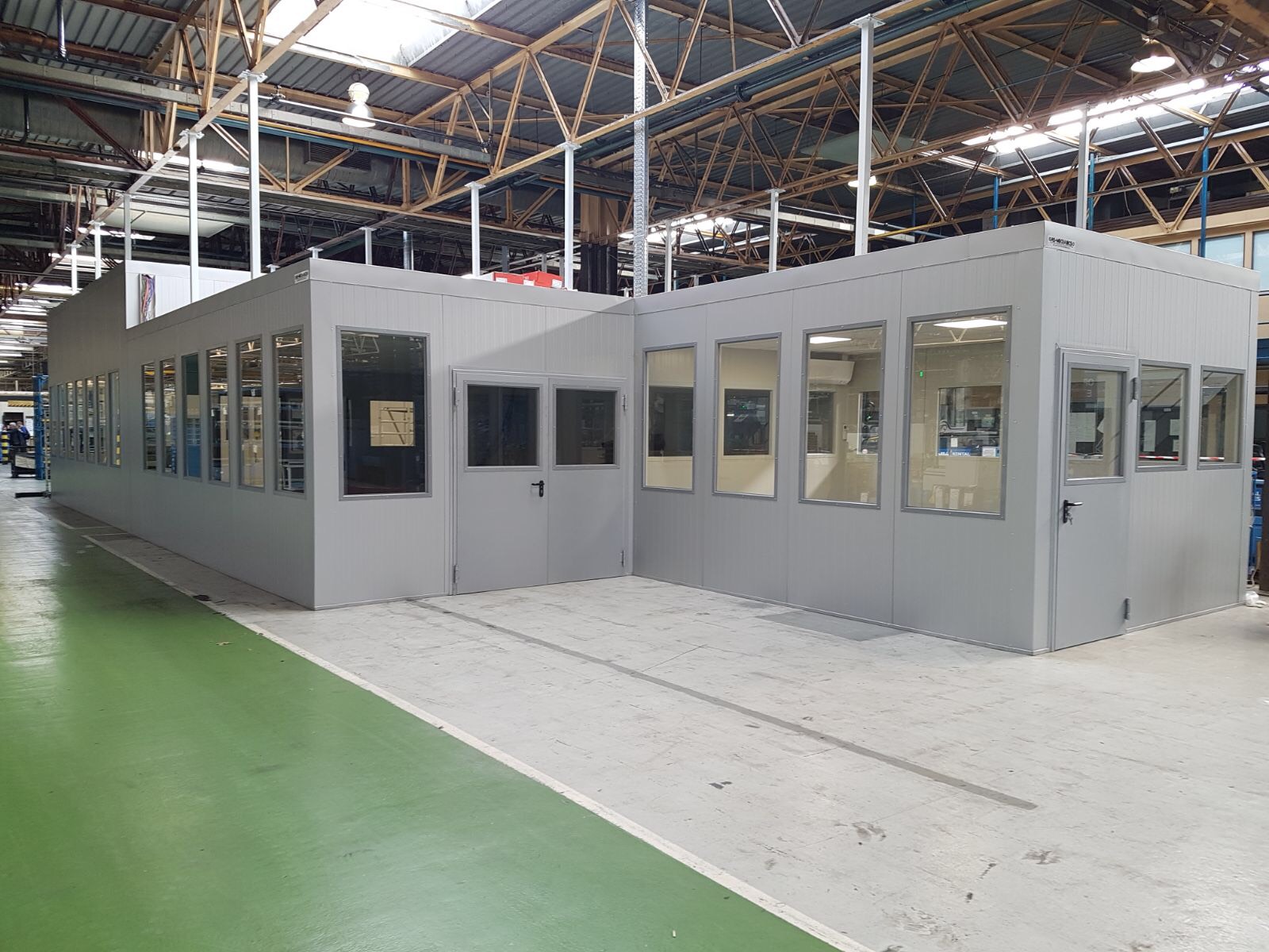 - Splitsing van een bestaande hal via een wand uit sandwichpanelen met geïntegreerde snellooppoort.